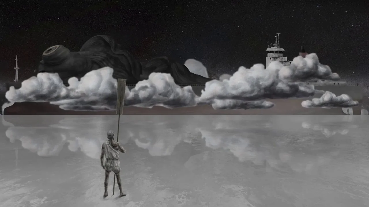 这个作品的灵感取材自《奥德赛》中奥德修斯在地狱中获得的预言。预言说,在奥德修斯最终回到故乡之后,他需要带着船桨深入内陆,直到有人将他的船桨误认为扬谷的簸箕,他便要就地把桨就地插在泥土里向波塞冬献祭,以此最终达到与神的和解。我对这个故事着迷是因为这个神秘主义的仪式里暗含了某种探索意义的边界的隐喻。动画里的金鱼船来自于我之前画的一张单幅作品,这个航行于地平线上的载着金鱼尸体货船的图像所隐含的意向,代表了我个人对于生命去向何方的思考。